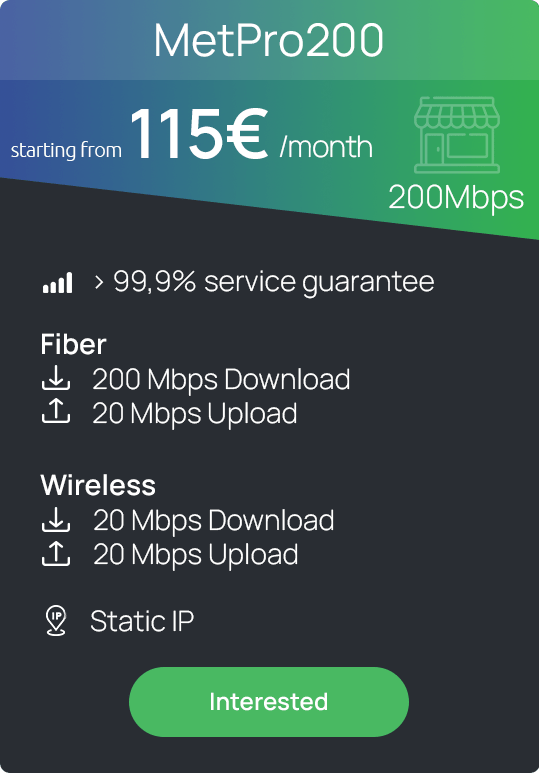 Metadosis ‘ Professional Internet service with SLA ensures business continuity through the combined power of Fiber and Wireless Internet. This ensures a stable and high-speed connection with guaranteed availability and performance, making it ideal for businesses that require uninterrupted and secure internet access.